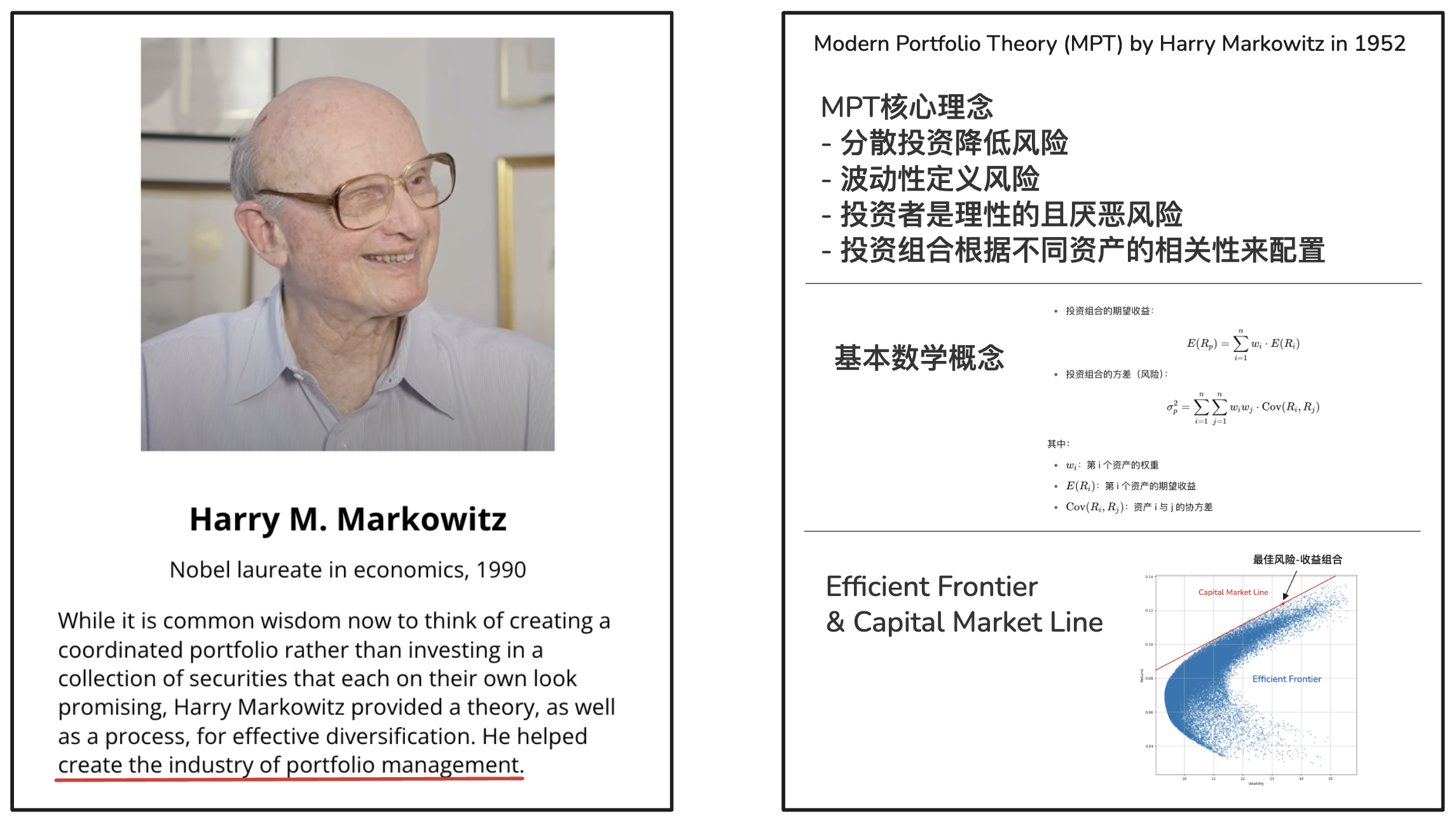 诺奖得主Harry Markowitz在1952年提出的理论框架和数学模型。是现代投资组合管理产业发展的理论基础。
