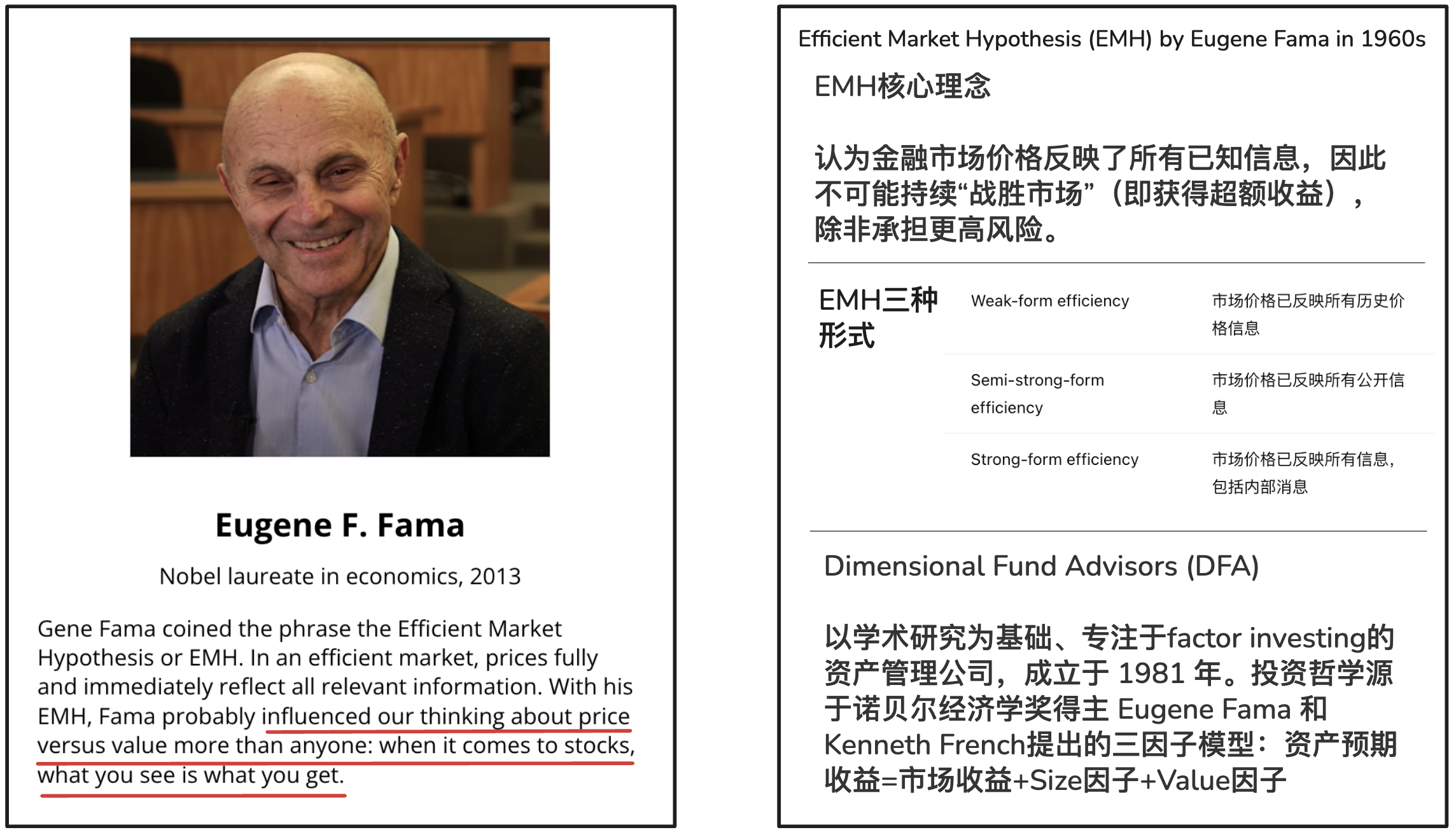 Eugene Fama在70年代提出的理论。Dimensional Fund Advisors学术型投资咨询公司:以Eugene Fama和Kenneth French因子投资(factor investing)研究为理论基础。