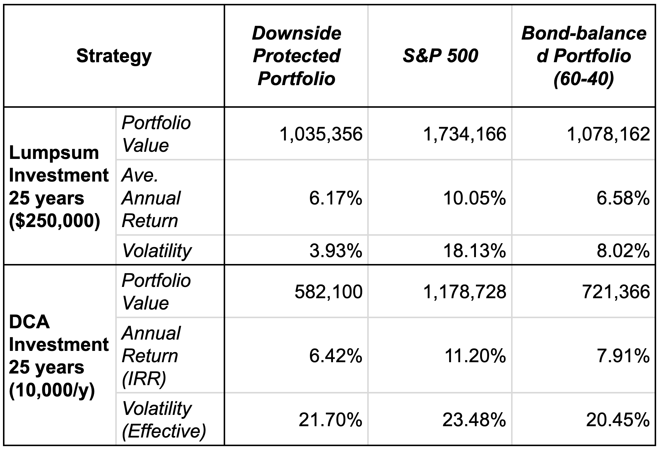 按一次性投资和年定投两种方式回测投资S&P500指数25年的收益对比(这里没有计算费率。下行保护的投资组合组合毕竟使用了期权衍生品等复杂策略,相比被动指数基金费率肯定更高):