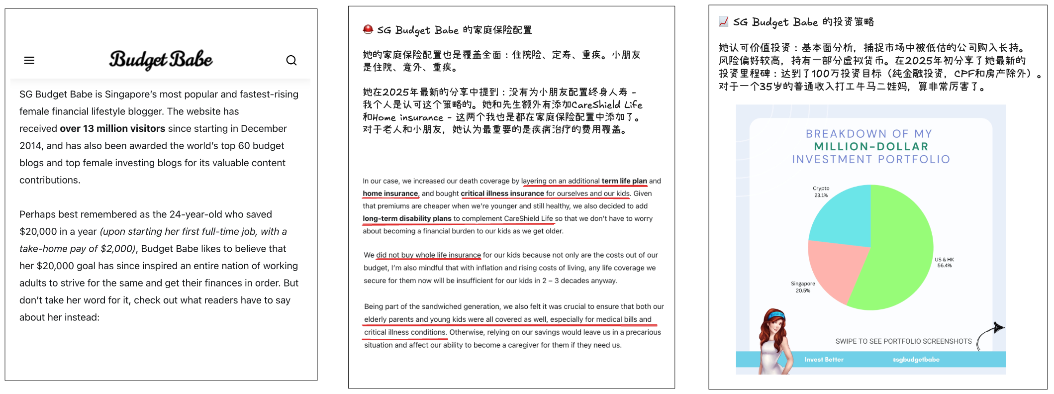 Dawn Cher自2014年起运营SG Budget Babe博客,积累了大量粉丝。作为女性投资者,她对风险管理尤为关注,写了许多保险相关的分析文章,从早期投资连结保险(ILP)踩坑,到医疗保险对比,再到高端医疗险的详细解析。此外,她还分享生活经验,如生育、买房装修、孩子教育等,内容实用贴近生活。