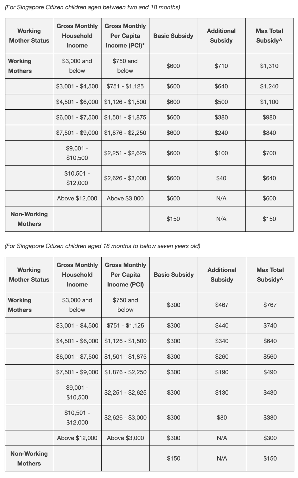 Childcare:$162 to 21,438($3 to 397x12x4.5,PG到K2)