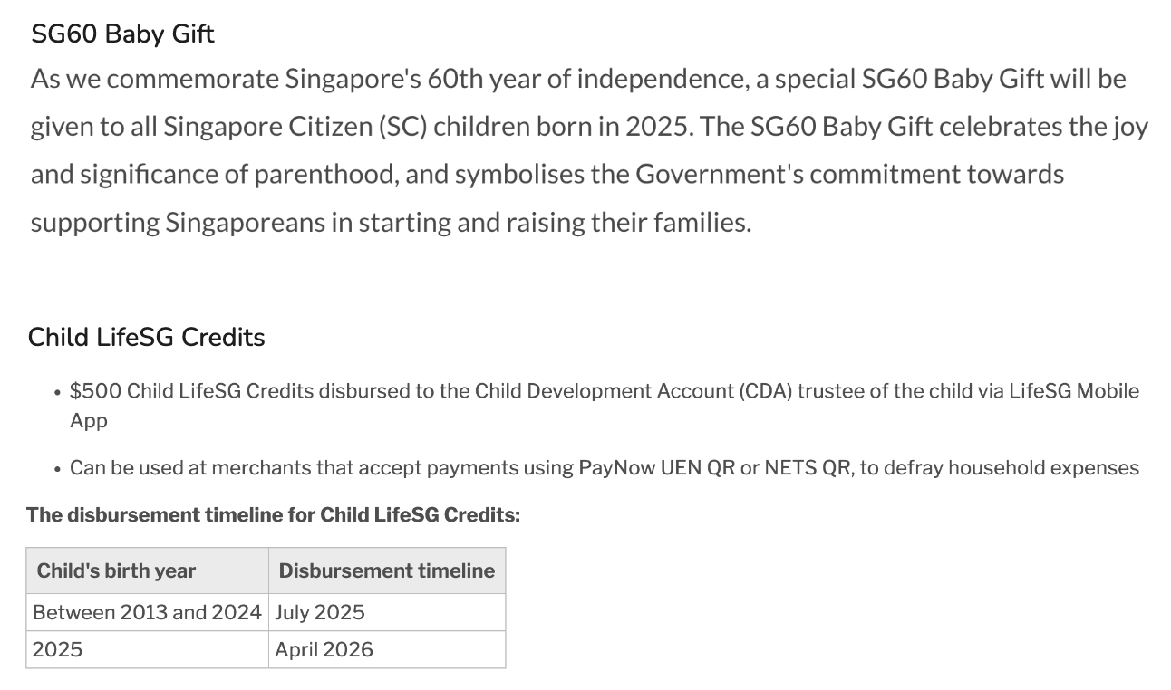 LifeSG育儿生活补助:$500(2025年出生宝宝可获,2026年发放)