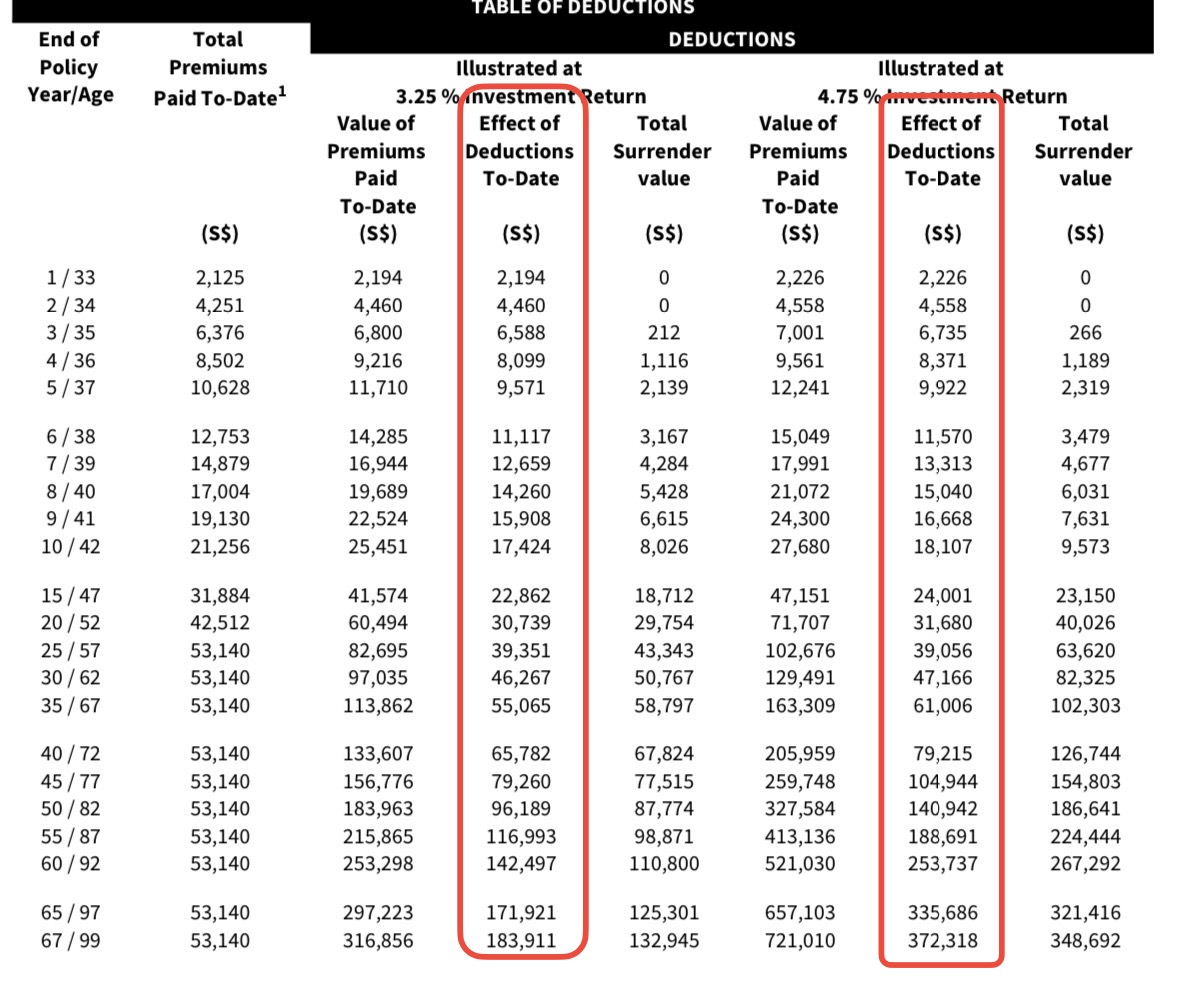 终身人寿有一定的缴费年限,供完之后就保障终身,感觉很划算也不用太操心。但金钱是有时间价值的(time value of money),你缴费完成的那部分钱一直在增值,而这是你获得终身保障的真正成本。成本是多少都不用自己算,这部分费用都写在保单的Price Table里Effect of Deductions To-Date一栏了(Effect of Deductions To-Date是MAS规定必须写明在合同里的信息)。可以拿出一份wholelife保险合同查看一下,你可能看到后期惊人的cost。