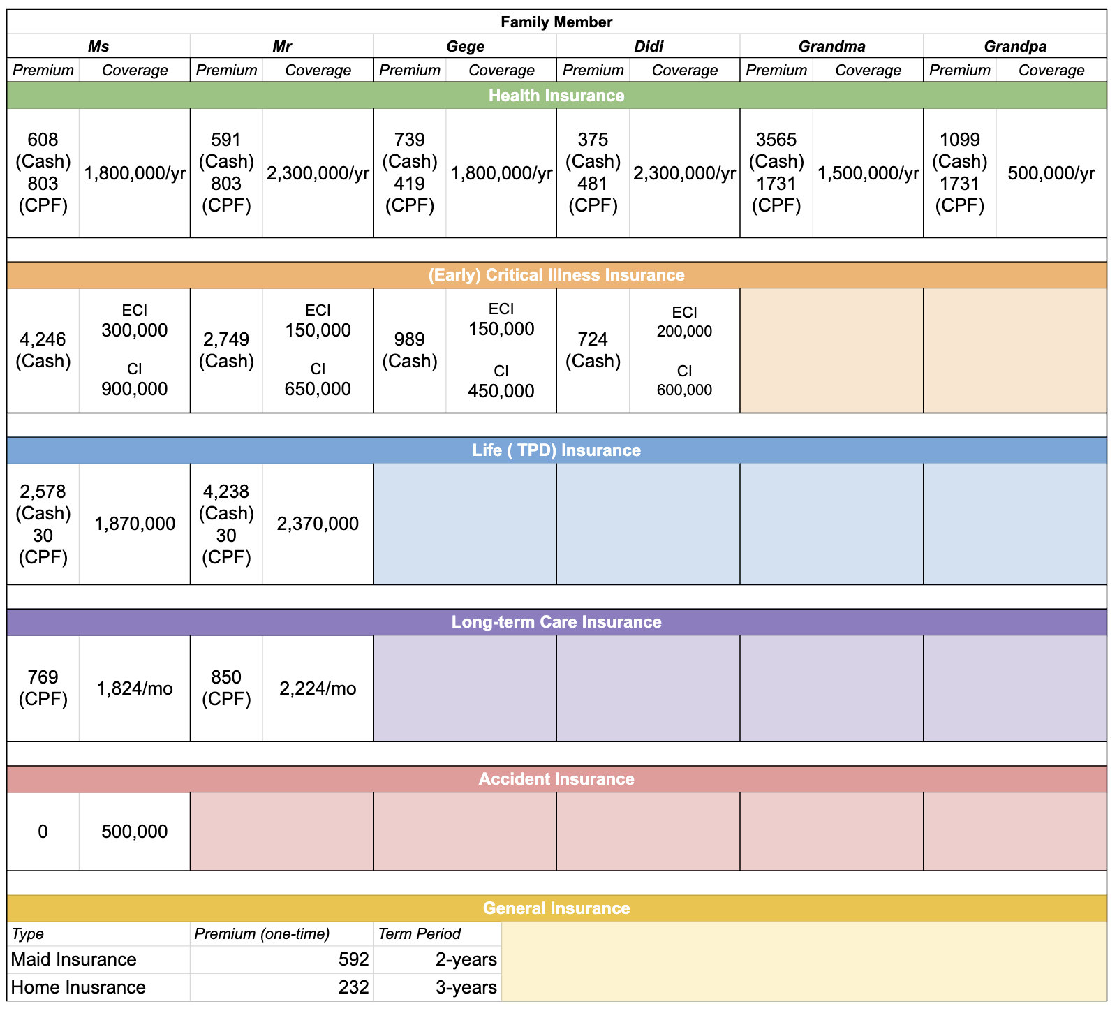 For our parents, comprehensive hospital coverage is already in place, and accident insurance is just a nice-to-have. In recent years, they’ve found life in Singapore a bit boring and spend a lot of time traveling and living in different cities. The accident policies required them to stay in Singapore for at least six months each year, which they didn’t meet last year. So we cancelled those policies altogether.