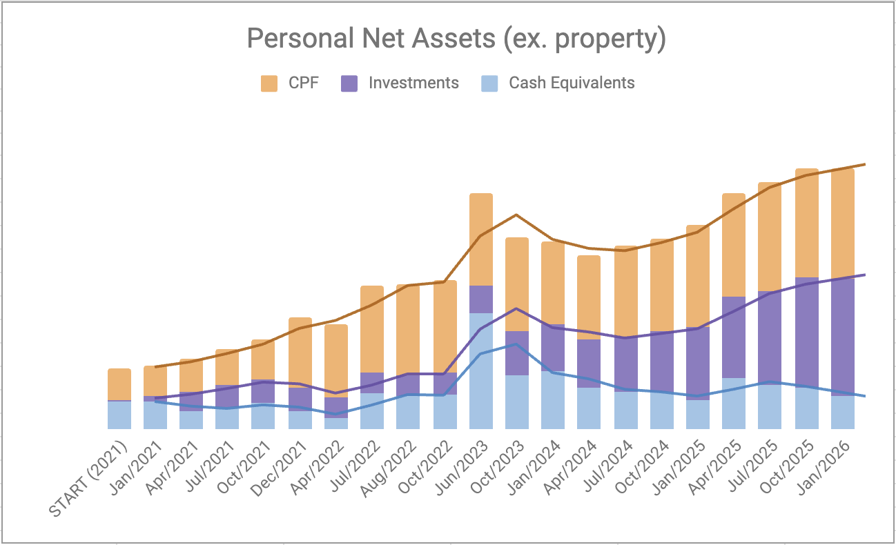 Over time, long-term accumulation plus compounding grew CPF to a meaningful size. Given my low risk tolerance, I’ve been very cautious with medium-to-high-risk investments, mostly doing small, slow DCA. On top of that, my husband has much higher equity exposure, so I intentionally keep my own risk level lower to balance our household portfolio.