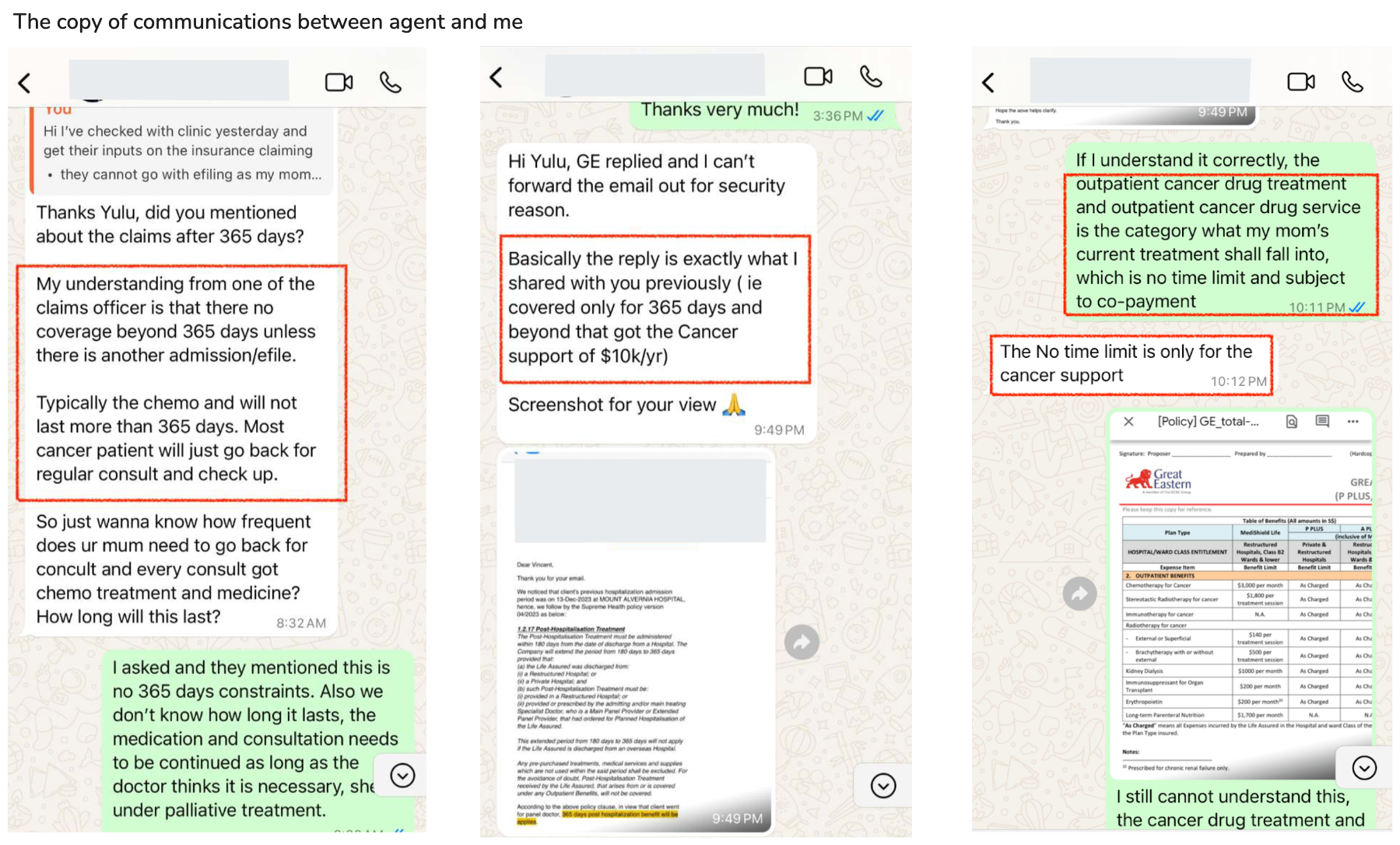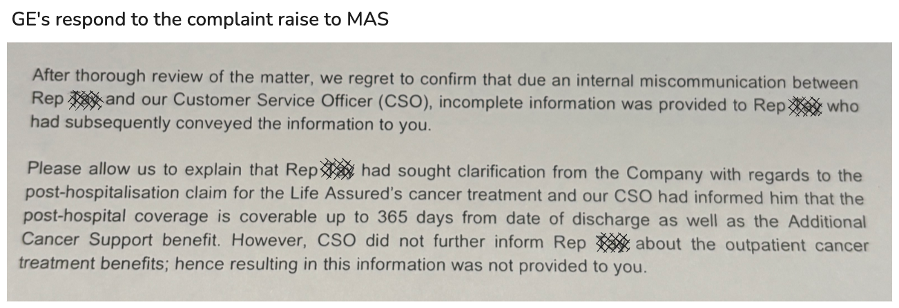 If this had been another cancer patient unfamiliar with insurance policy terms and entirely reliant on the agent’s information, they might have surrendered their policy under the mistaken belief that insurance could no longer reimburse ongoing treatment. Later on, they would be even more likely to lose the best treatment opportunity because they could no longer afford the medication costs. I feel that continuing to argue with the insurance company is of limited value. After all, the agent’s negligence did not cause me direct financial loss. I hope they will take this issue seriously, ensure that insurance agents continuously learn and keep up with frequently changing hospitalisation insurance policy terms, and provide better support to clients. After all, if a so-called “financial advisor” has a fundamentally incorrect understanding of the product, how can they possibly help clients with proper financial planning? The insurance company also responded: